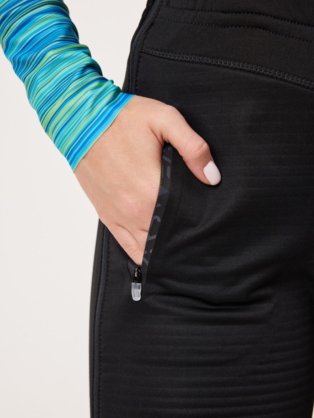Сзади - эластичный материал для большей свободы движений и лучшего влагоотвода. Эластичный материал дополнительно утеплен внутри.
