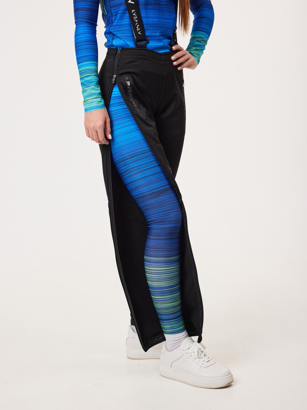 Подтяжки выполнены и плотного, эластичного материала и крепятся на липучки. По бокам сплошные молнии, которые легко расстегиваются для быстрого переодевания.
