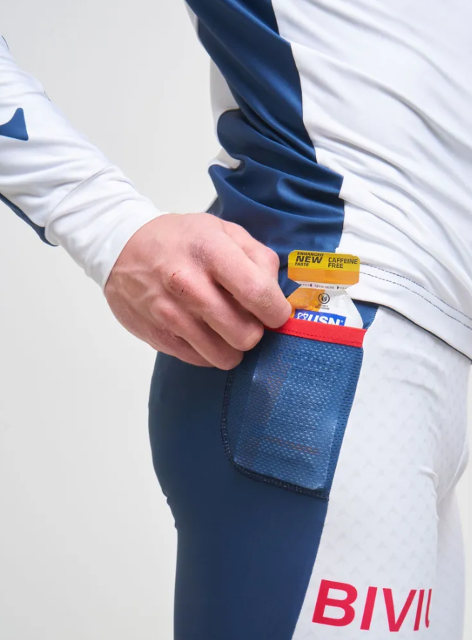 Вместительный задний карман на молнии для ключей/телефона или дополнительного питания создает поистине неповторимый образ идеальной экипировки для длительных гонок или тренировок.